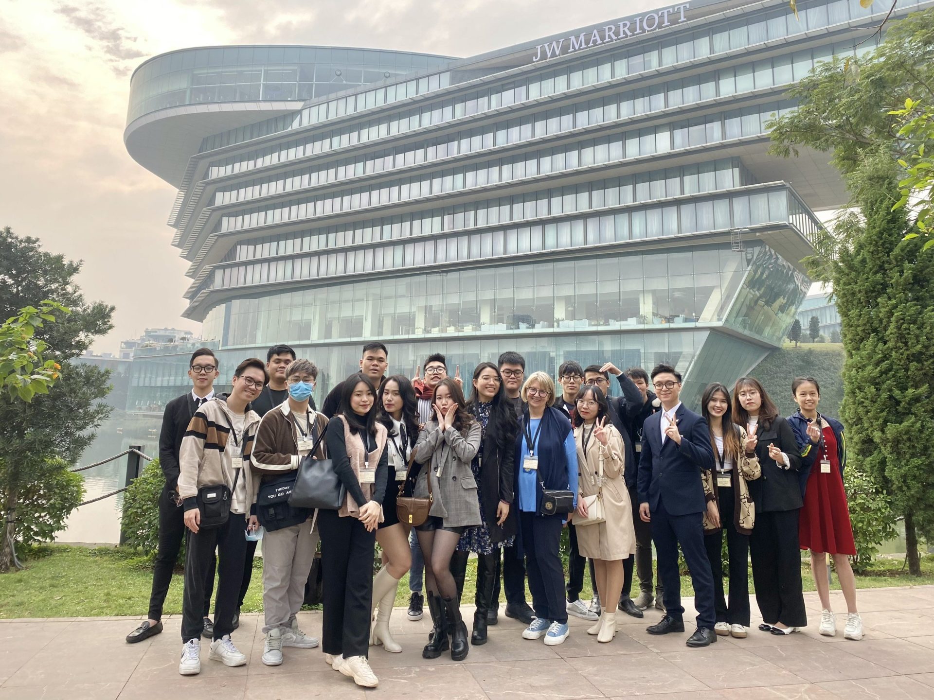 Ngày 9/1/2023, chúng em đại diện cho sinh viên ngành Ngôn ngữ Anh – Khoa Du lịch và Ngoại ngữ – Học viện Nông nghiệp Việt Nam cùng với sinh viên Khoa Ngoại ngữ – Đại học Hà Nội đã có chuyến tham quan khách sạn 5 sao JW Marriott đầy ý nghĩa. Ngay từ khi bước chân vào cổng khách sạn 5 sao JW MARRIOTT, chúng em đã cảm nhận được sự sang trọng và hào nhoáng của khách sạn cũng như sự thân thiện và chuẩn mực về chăm sóc khách hàng khi nghỉ chân tại đây. Toàn bộ nhân viên đang làm việc trong khách sạn đều tạo cho chúng em cũng như các khách lưu trú tại đây sự gần gũi, thân thiện, thoải mái khi tiếp xúc, giúp chúng em khỏi bỡ ngỡ trước sự mới lạ này và đó cũng là động lực để chúng em có niềm quyết tâm về định hướng công việc trong tương lai gần nhất một cách tự tin.