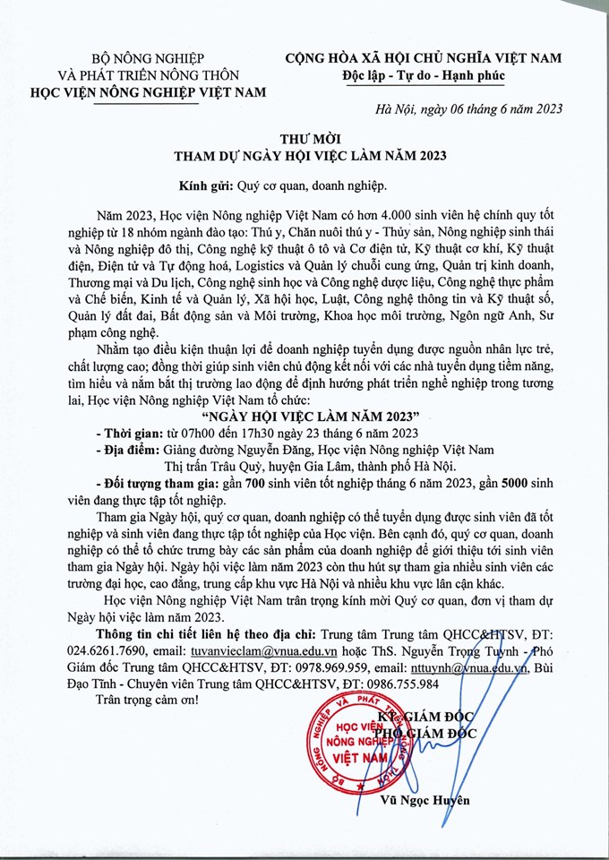 Học viện Nông nghiệp Việt Nam trân trọng kính mời Quý Cơ quan, Doanh nghiệp tham dự Chương trình Ngày hội việc làm vào ngày 23 tháng 6 năm 2023